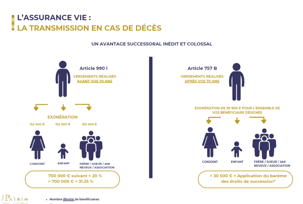 - Transmission avantageuse : L’assurance vie permet de transmettre un patrimoine avec une fiscalité optimisée.